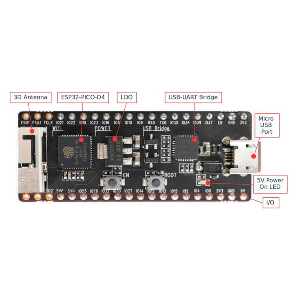 Standard ESP32-PICO-D4-Modul an die ESP32-PICO-KIT V4-Platine gelötet. Das komplette System des ESP32-Chips wurde in das SIP-Modul integriert und erfordert nur eine externe Antenne mit LC-Anpassungsnetzwerk, Entkopplungskondensatoren und Pull-Up-Widerstände für EN-Signale, um ordnungsgemäß zu funktionieren.